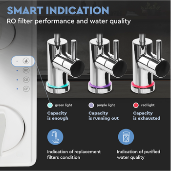 Το σύστημα φιλτραρίσματος διασφαλίζει σταθερά καθαρό νερό και διαθέτει παρακολούθηση σε πραγματικό χρόνο μέσω ενός έξυπνου δείκτη στη βρύση. Αυτό σας επιτρέπει να ελέγχετε εύκολα την κατάσταση των φίλτρων, προσφέροντας τη βεβαιότητα για ασφαλές και καθαρό νερό σε κάθε χρήση.