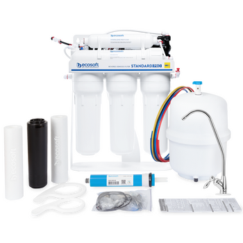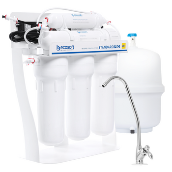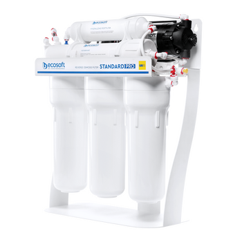 Ecosoft Standard PRO με φίλτρο ιχνοστοιχείων και αντλία σε ανθεκτικό μεταλλικό ράφι προσφέρει αποδοτικό και αξιόπιστο καθαρισμό νερού μέσω μιας ολοκληρωμένης πολυβάθμιας διαδικασίας, εξασφαλίζοντας ασφαλές, καθαρό και γευστικό νερό για το νοικοκυριό σας.